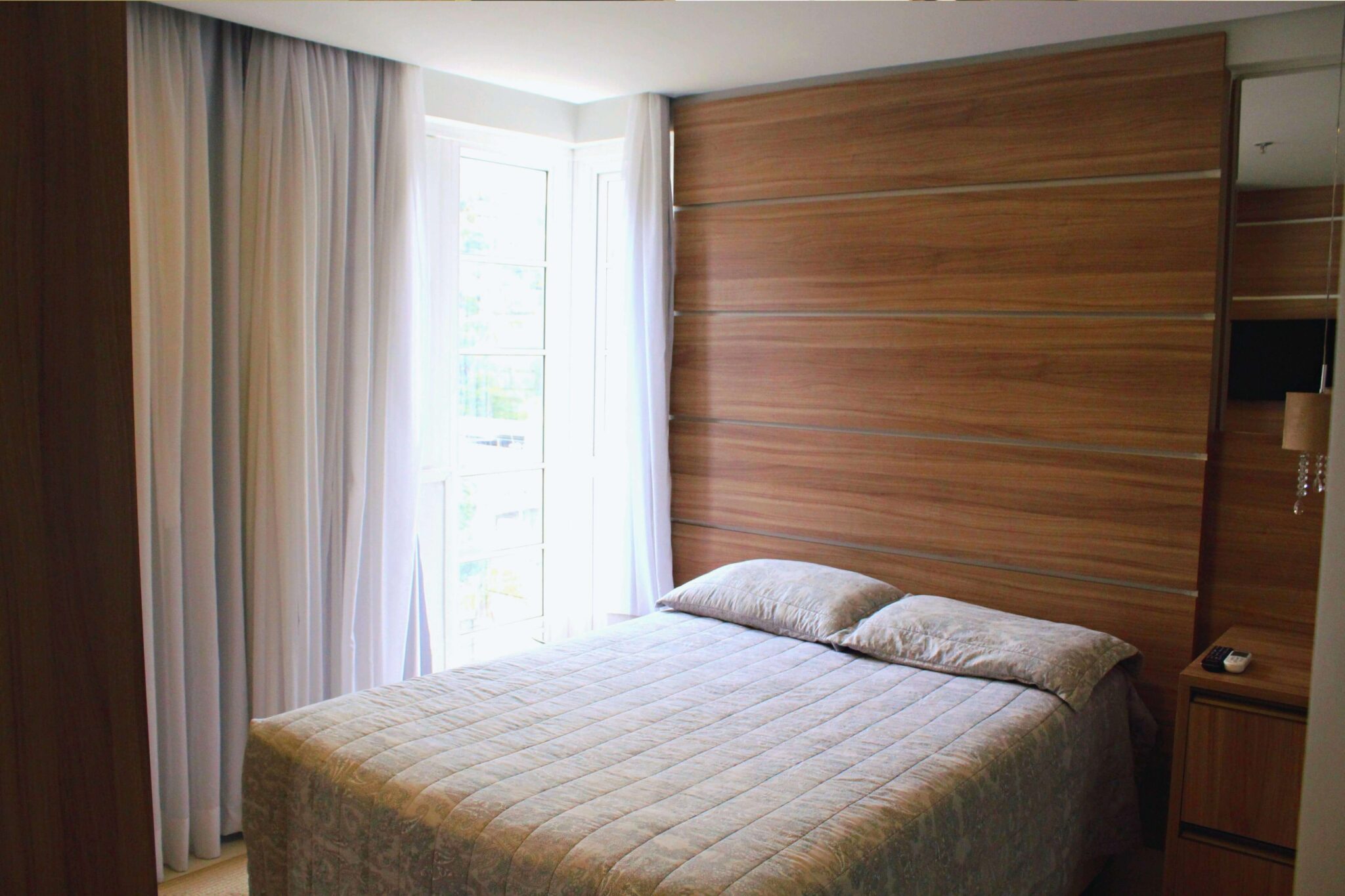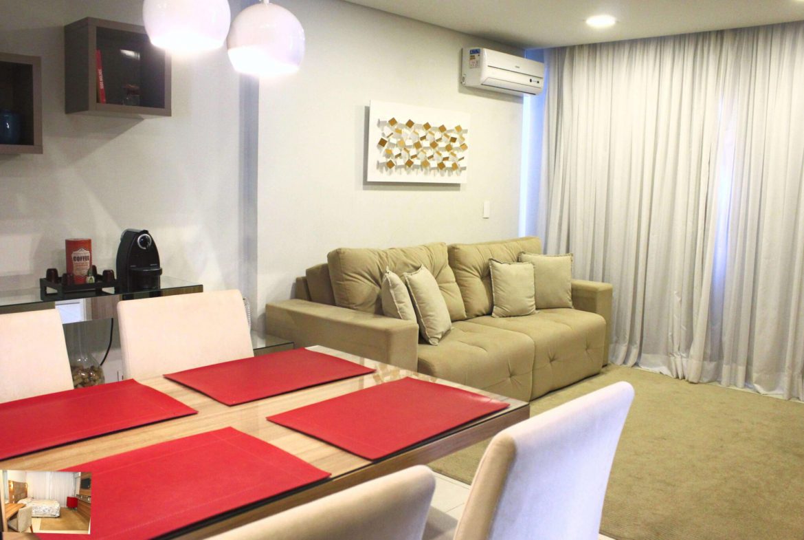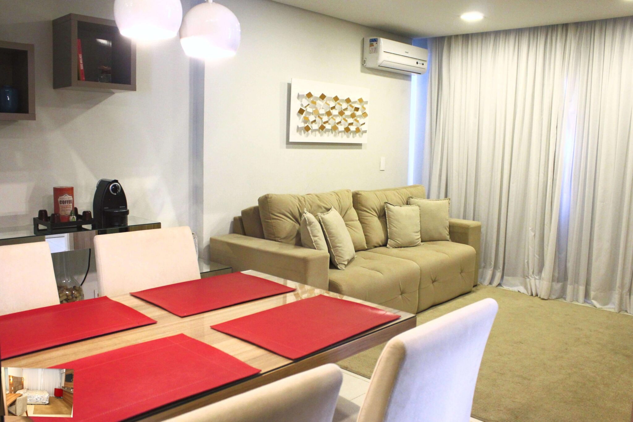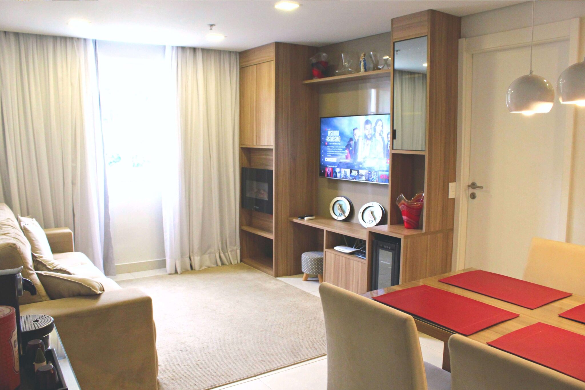 O apartamento possui duas suítes, sala de jantar e estar, cozinha equipada com utensílios essenciais e vista para as montanhas.