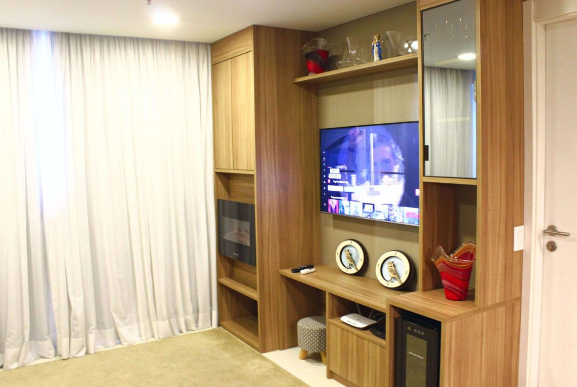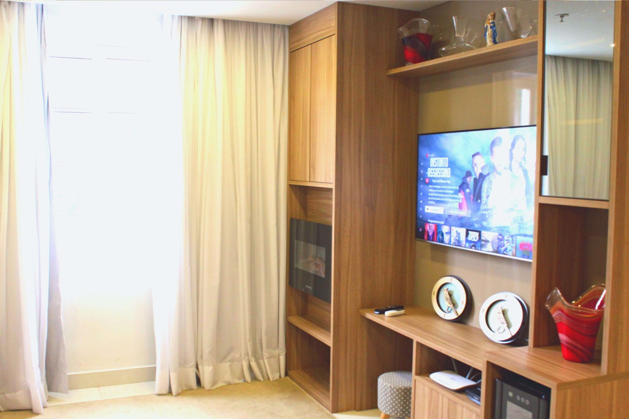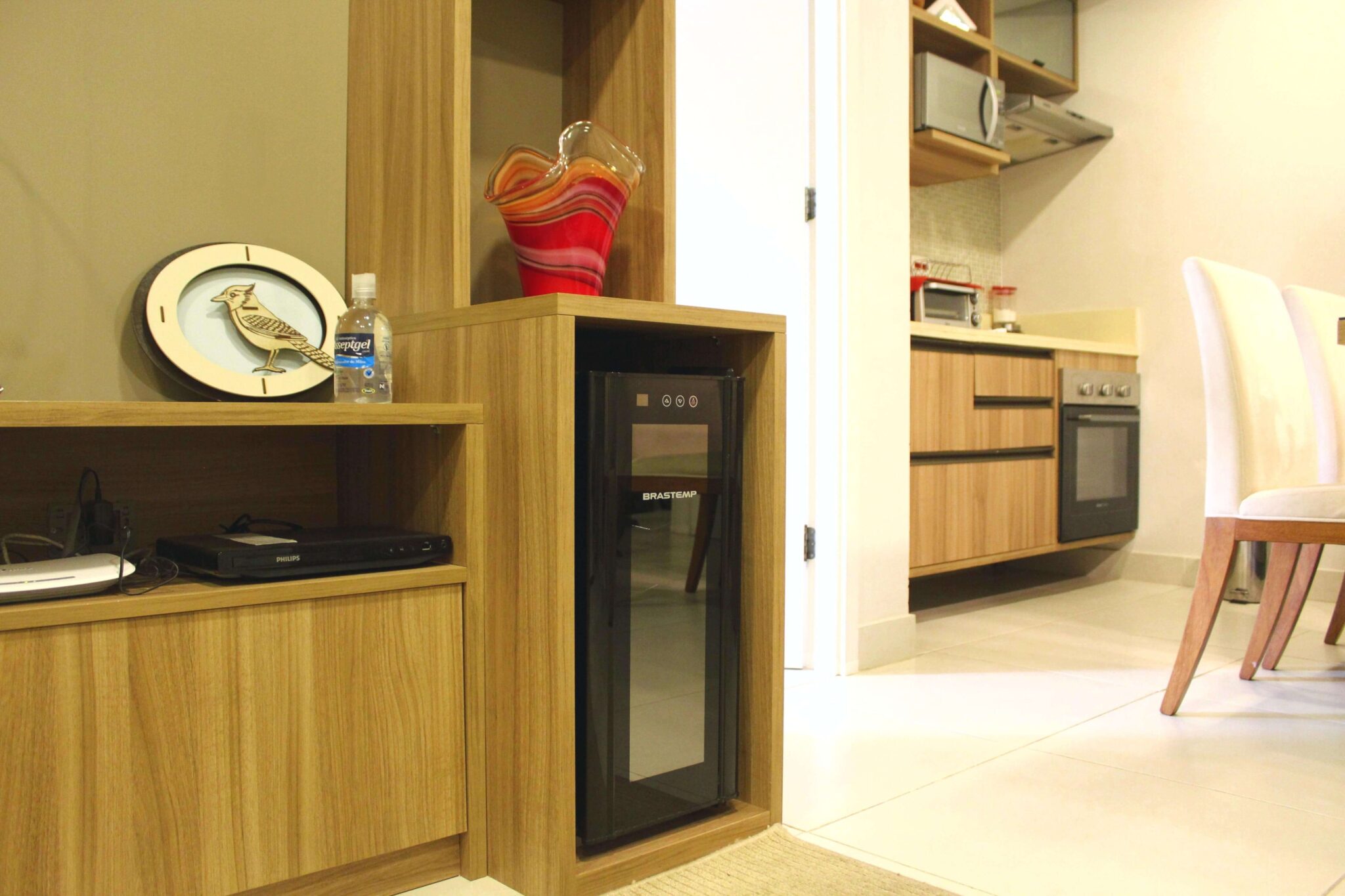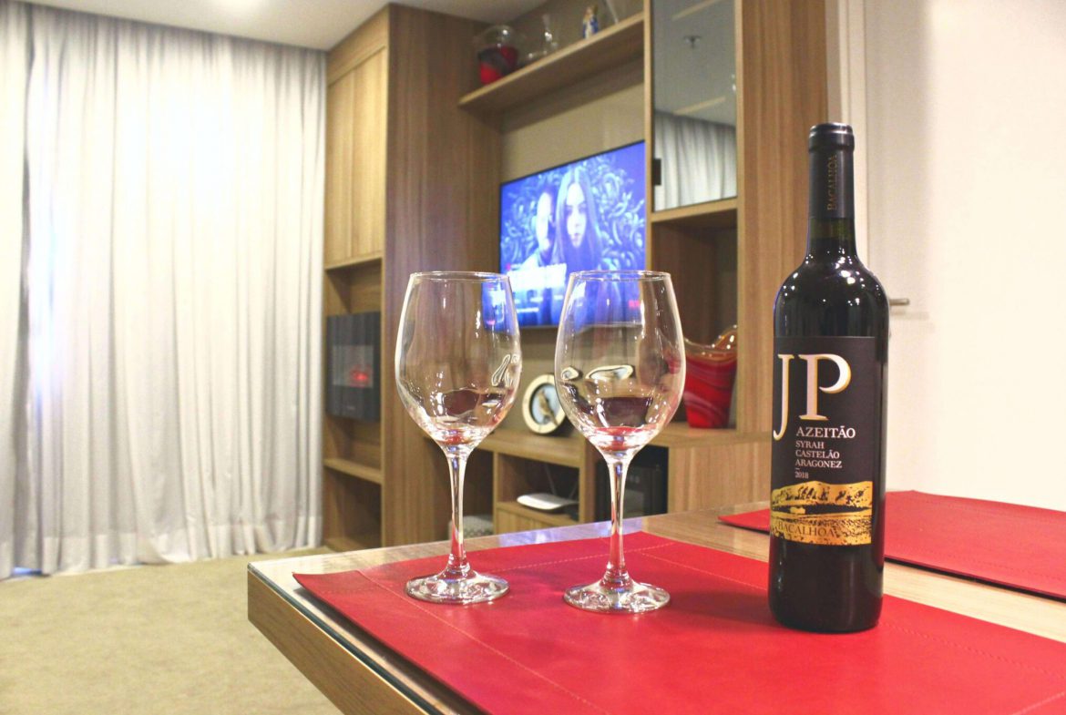 O apartamento possui duas suítes, sala de jantar e estar, cozinha equipada com utensílios essenciais e vista para as montanhas.