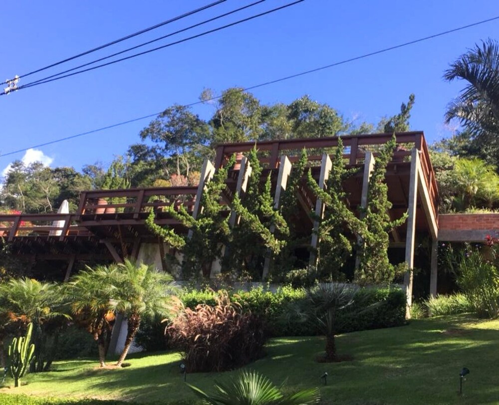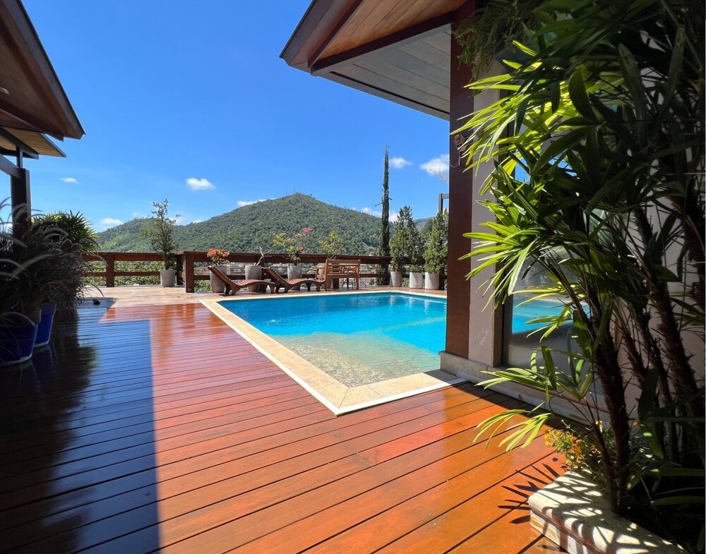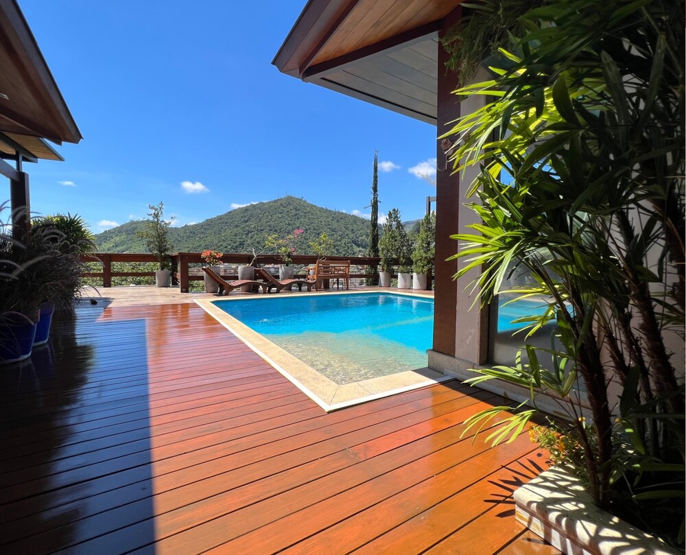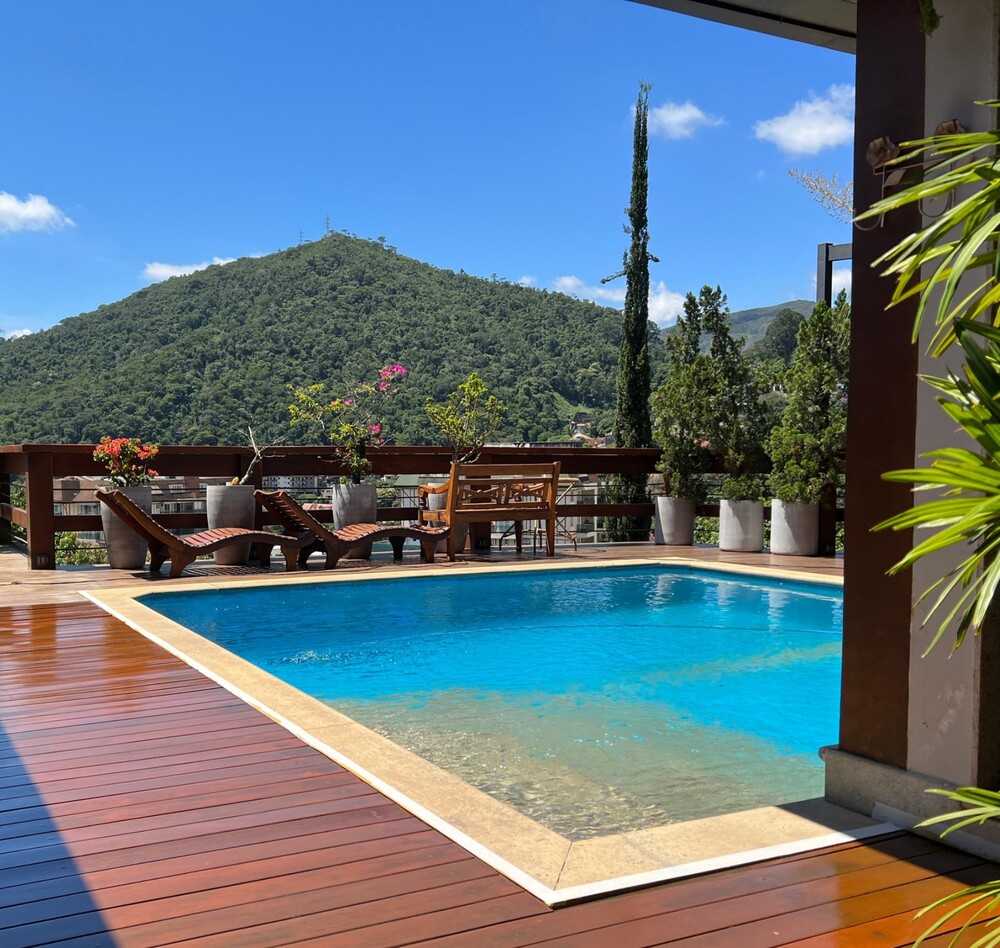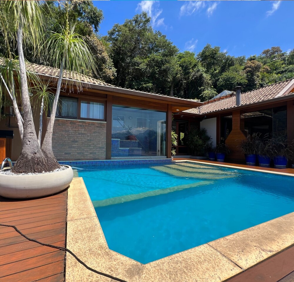 Um amplo deck com piscina e sauna oferece uma vista privilegiada para as montanhas da serra. Além disso, a casa conta com uma área gourmet recém-reformada, perfeita para momentos especiais.