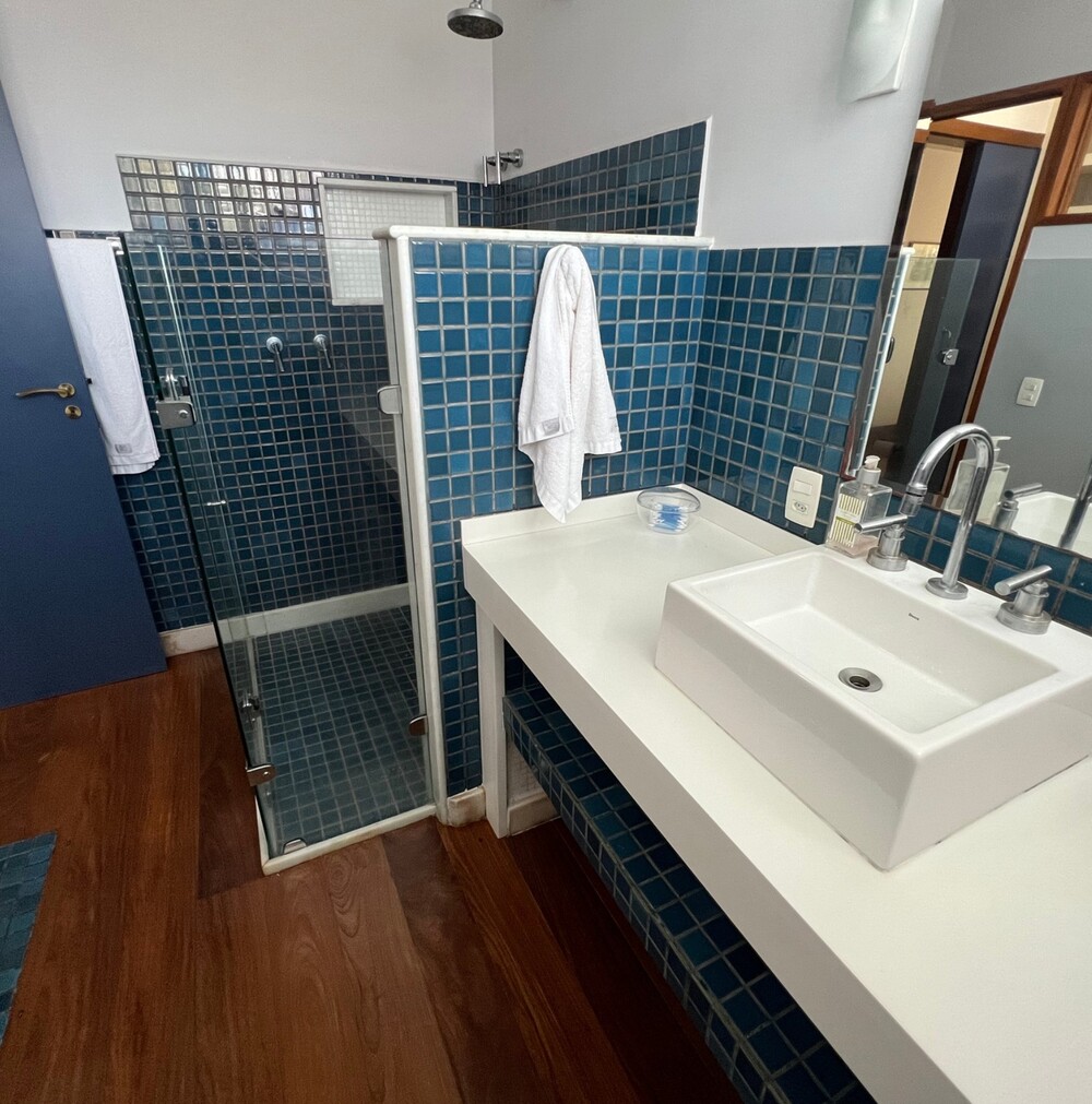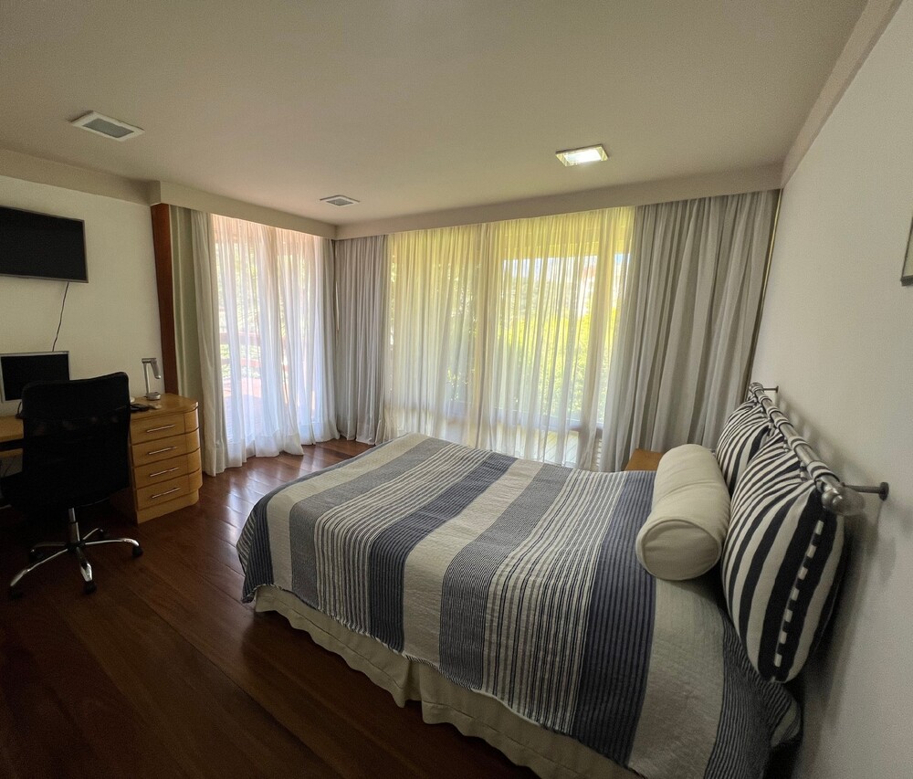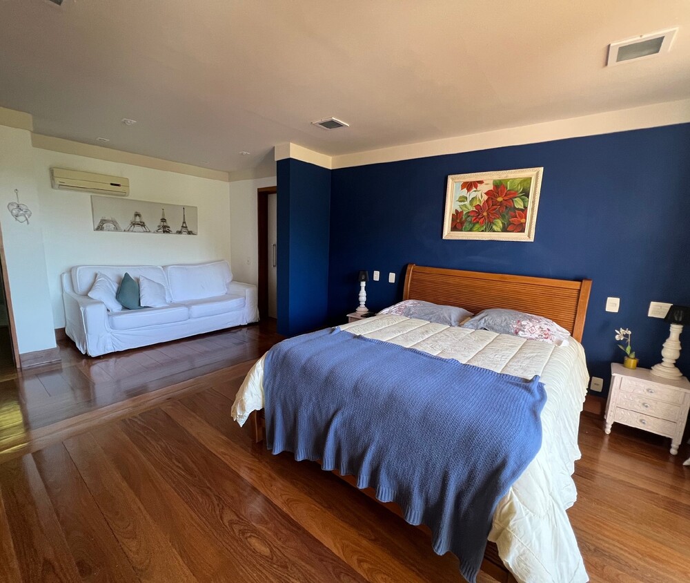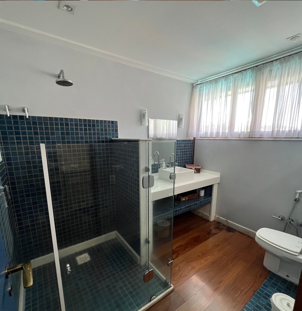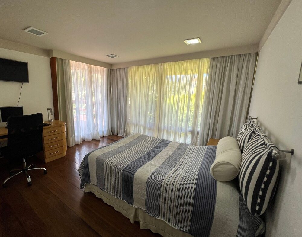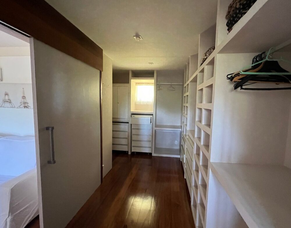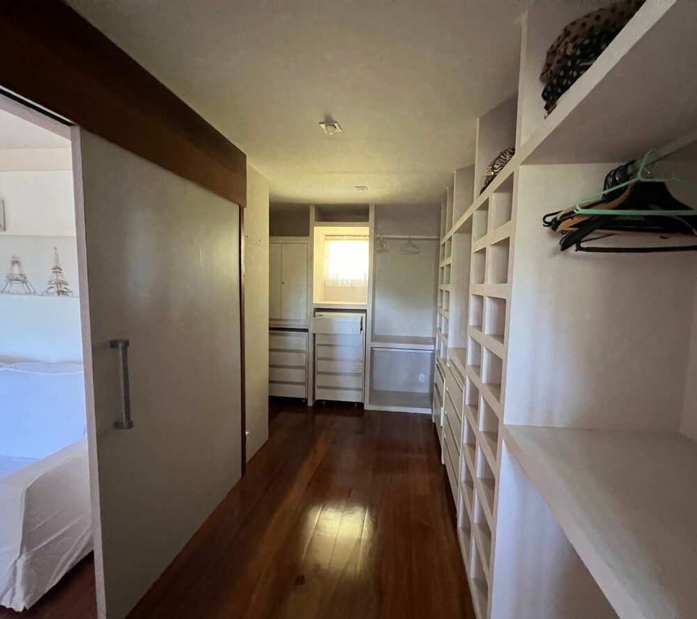A suíte master possui varanda, dois banheiros independentes e um closet integrado. No pavimento superior, há uma ampla suíte com teto em madeira, garantindo charme e aconchego. No pavimento inferior, suítes com closets espaçosos possuem acesso à varanda que contorna a casa.