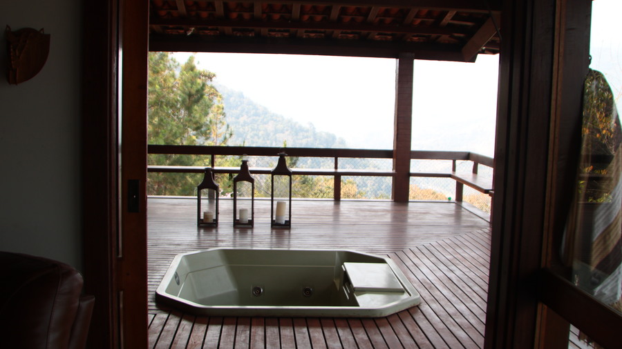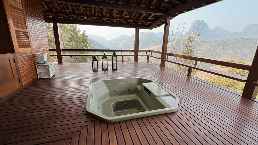 • Uma jacuzzi ao ar livre, integrada ao deck, permite relaxar enquanto se aprecia a vista das montanhas.