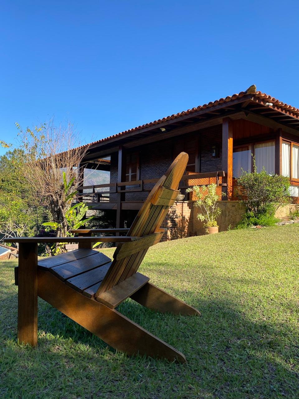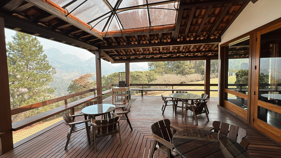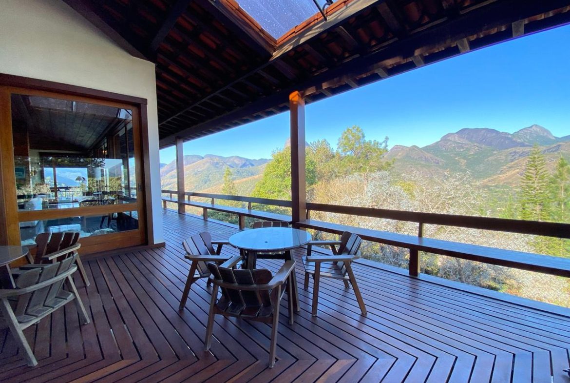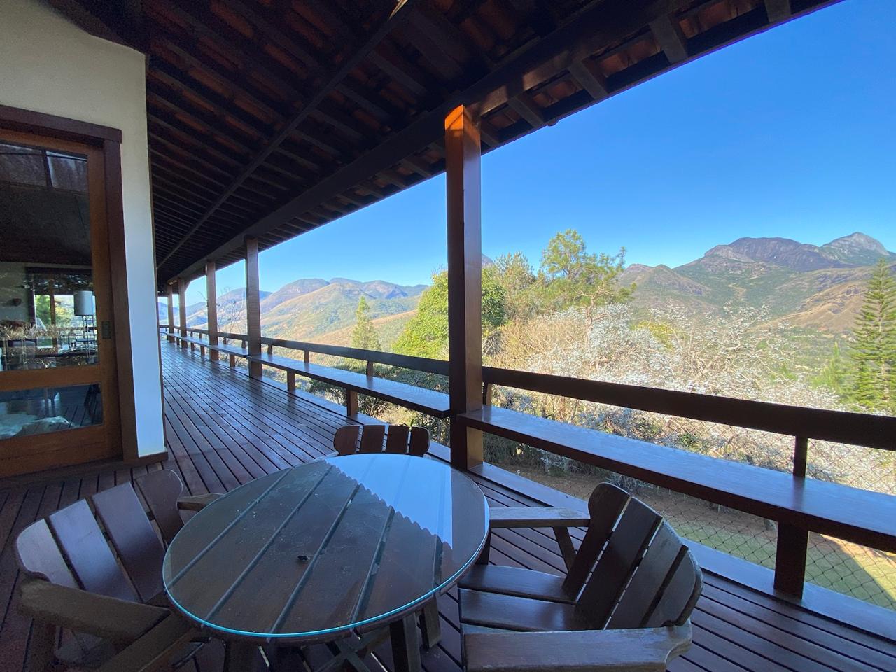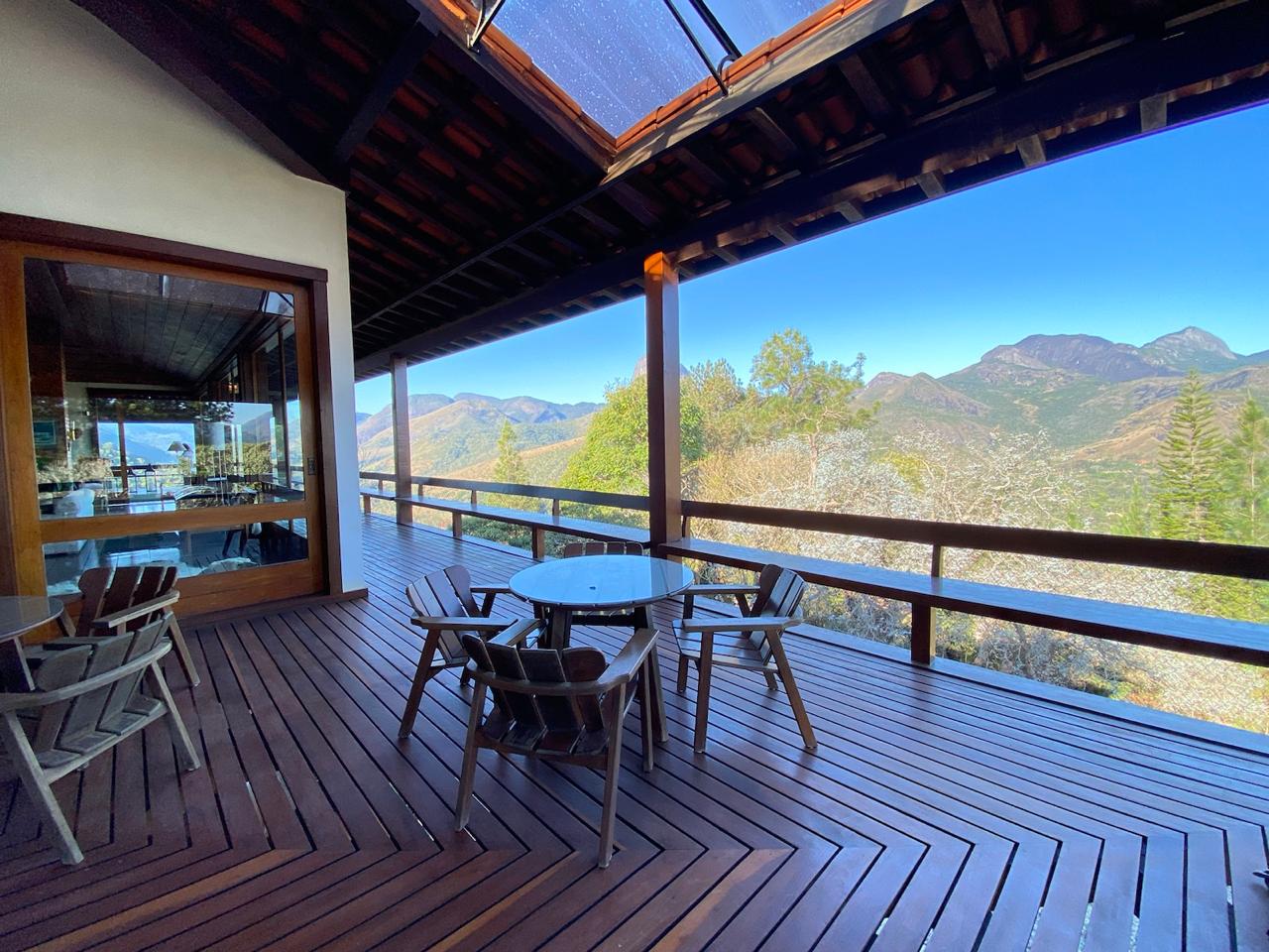 • A sala de jantar, por exemplo, é ampla e oferece uma vista panorâmica. Além disso, dá acesso ao deck de madeira que circunda toda a casa, tornando-a ideal para apreciar a beleza natural da região.