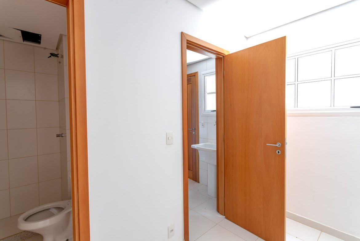 A ampla sala, dividida em três ambientes, é ideal para momentos de lazer e convivência. Um lavabo está disponível para maior conforto. Além disso, a cozinha, equipada com armários planejados Todeschini, oferece estilo e praticidade. A área de serviço funcional completa este pavimento, garantindo organização e conveniência.