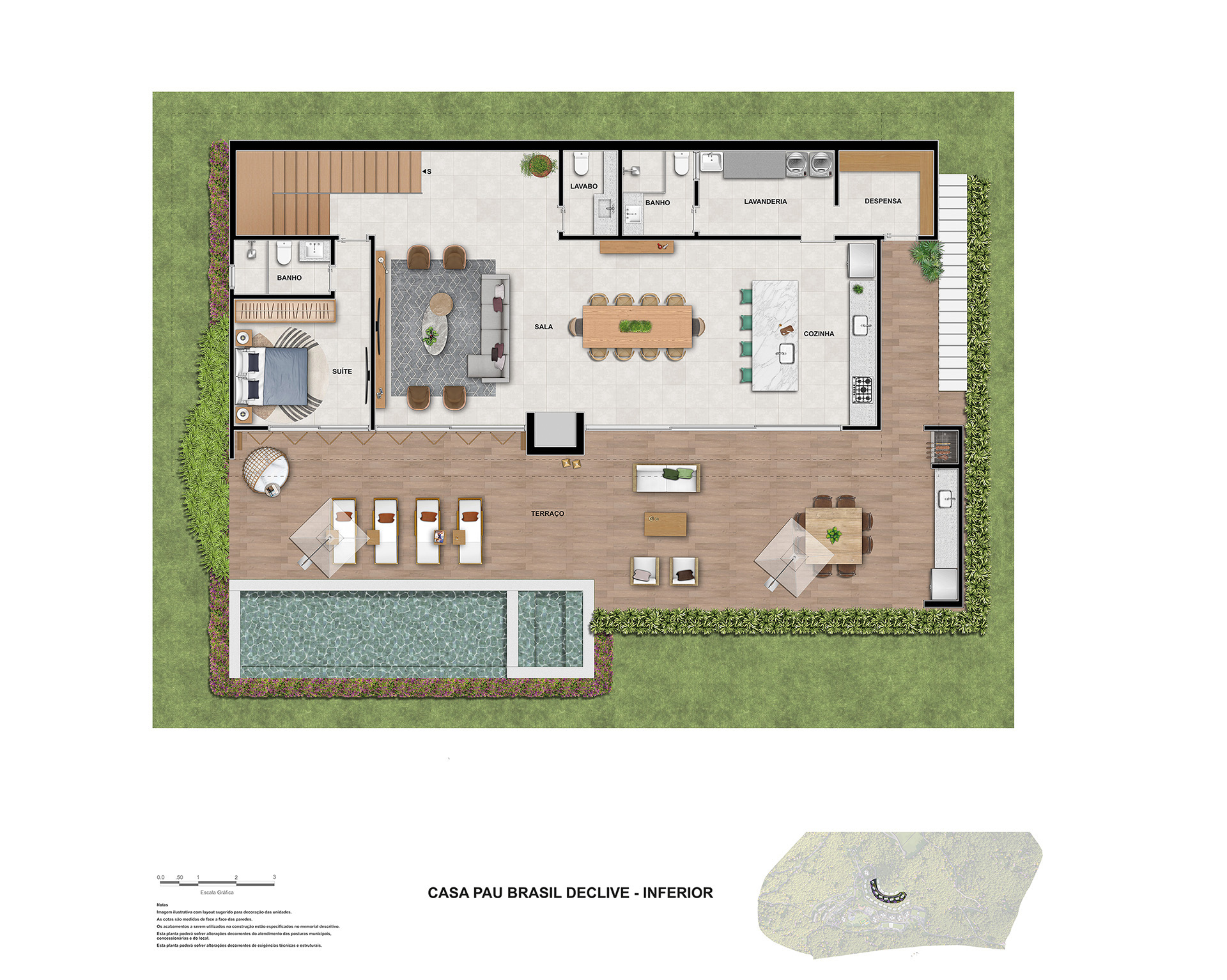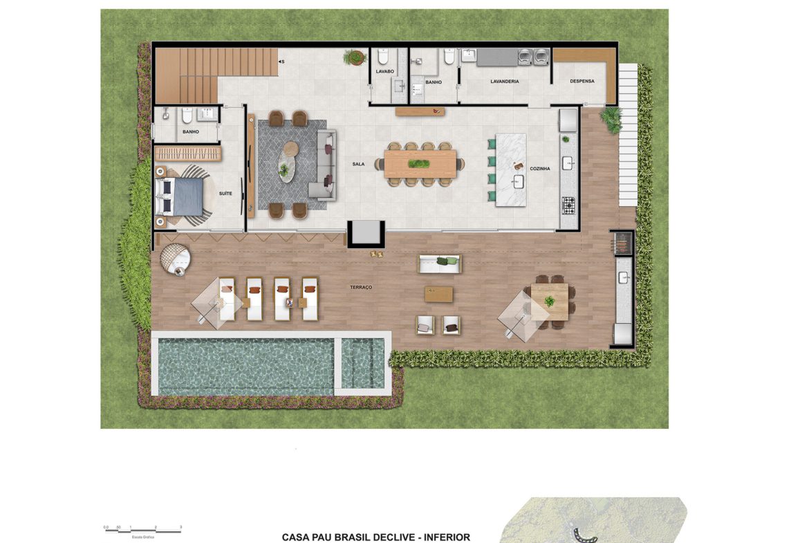 A residência ainda oferece uma lavanderia funcional e uma despensa espaçosa, garantindo a organização e a praticidade na sua rotina. Portanto, você pode focar no que realmente importa: viver plenamente.