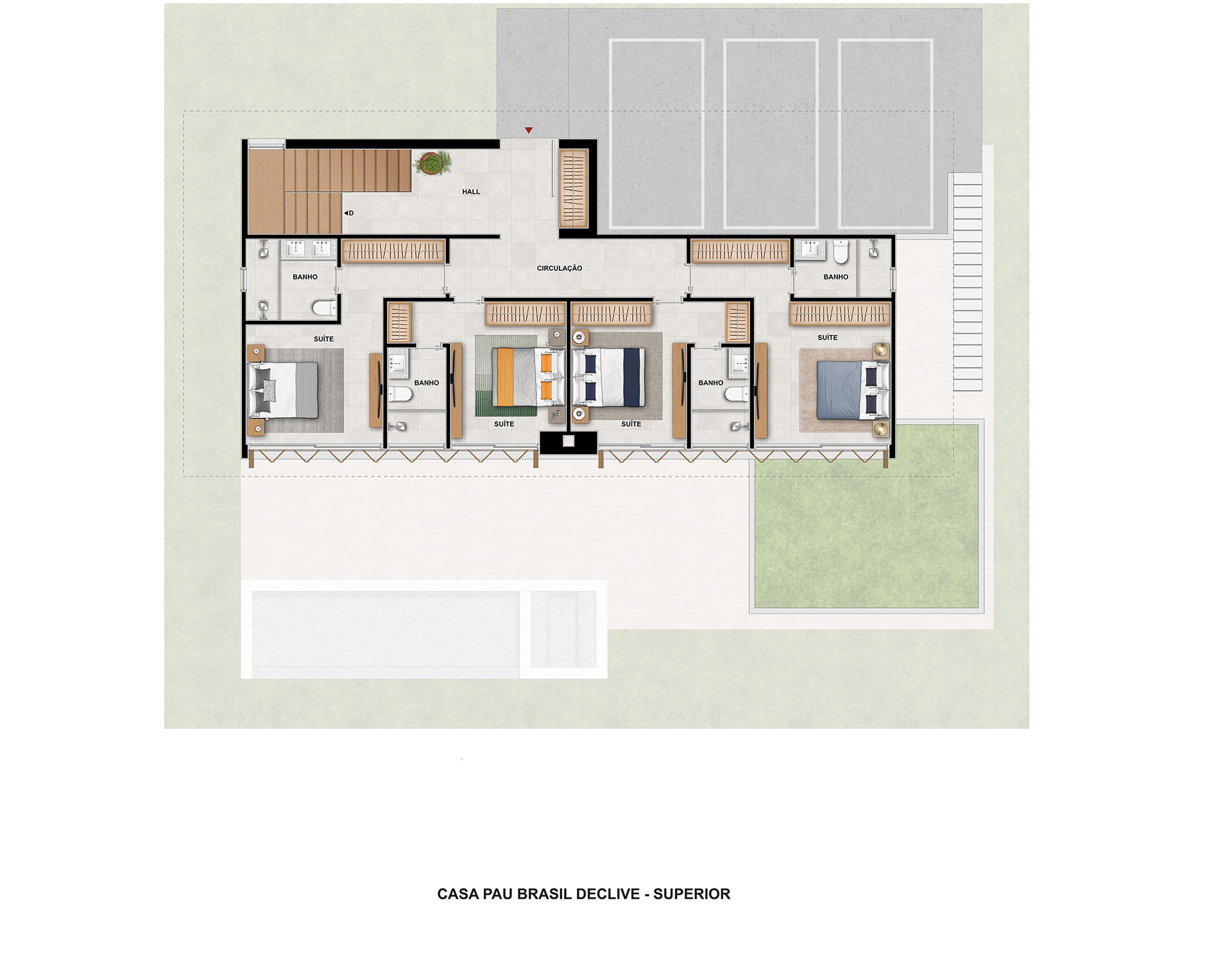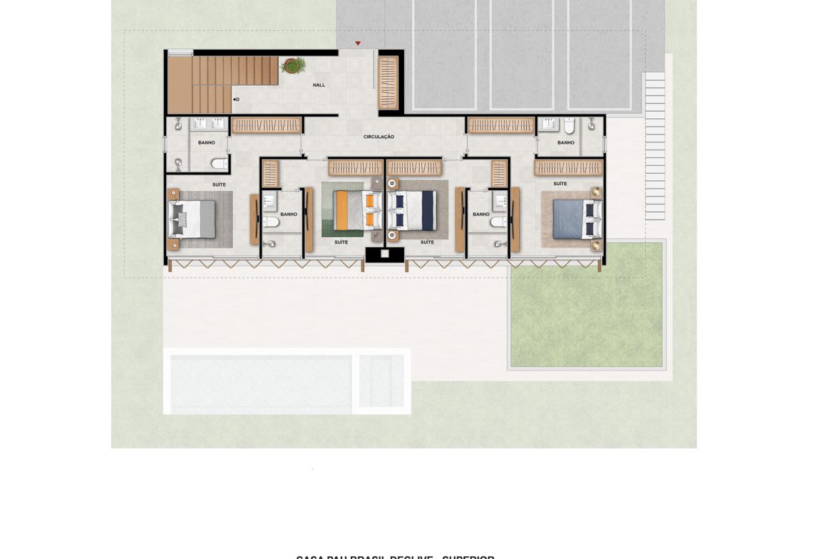 Com cinco suítes, nós projetamos cada uma para ser um santuário de tranquilidade e conforto. As suítes oferecem o espaço necessário para você descansar e aproveitar a privacidade, com banheiros privativos que proporcionam um toque de spa diário.