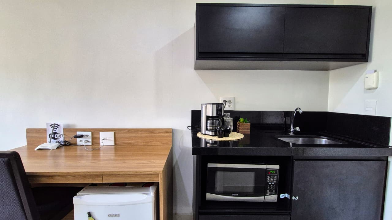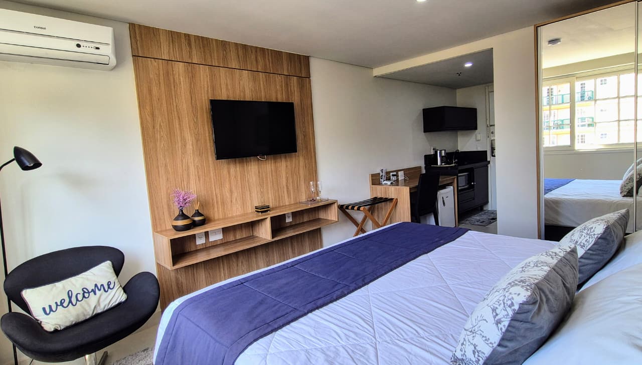 Nós preparamos o studio com mobília completa e uma decoração charmosa, garantindo que sua única preocupação seja relaxar. Além disso, a cama confortável, o ar-condicionado e o Wi-Fi de alta velocidade asseguram o seu bem-estar em qualquer estação do ano.