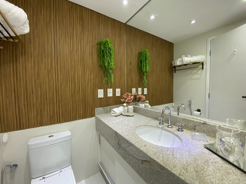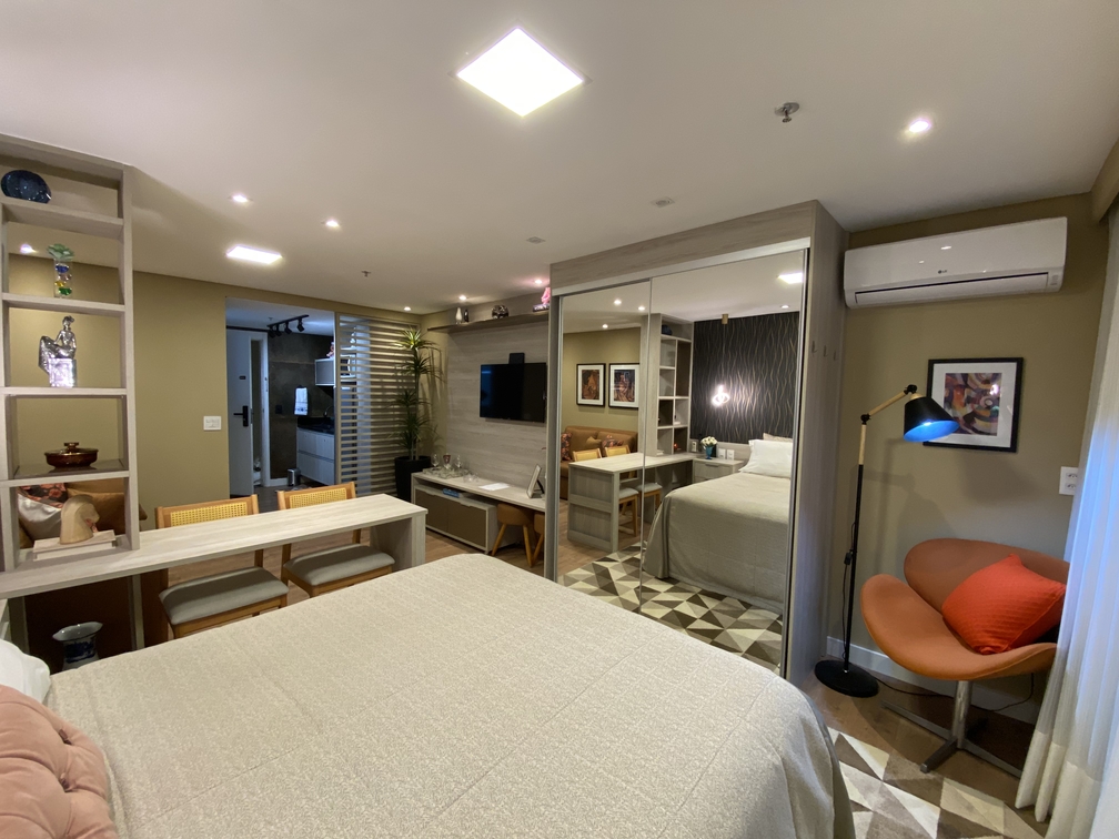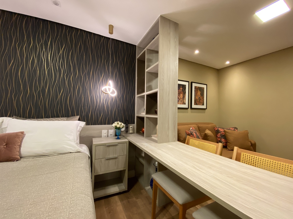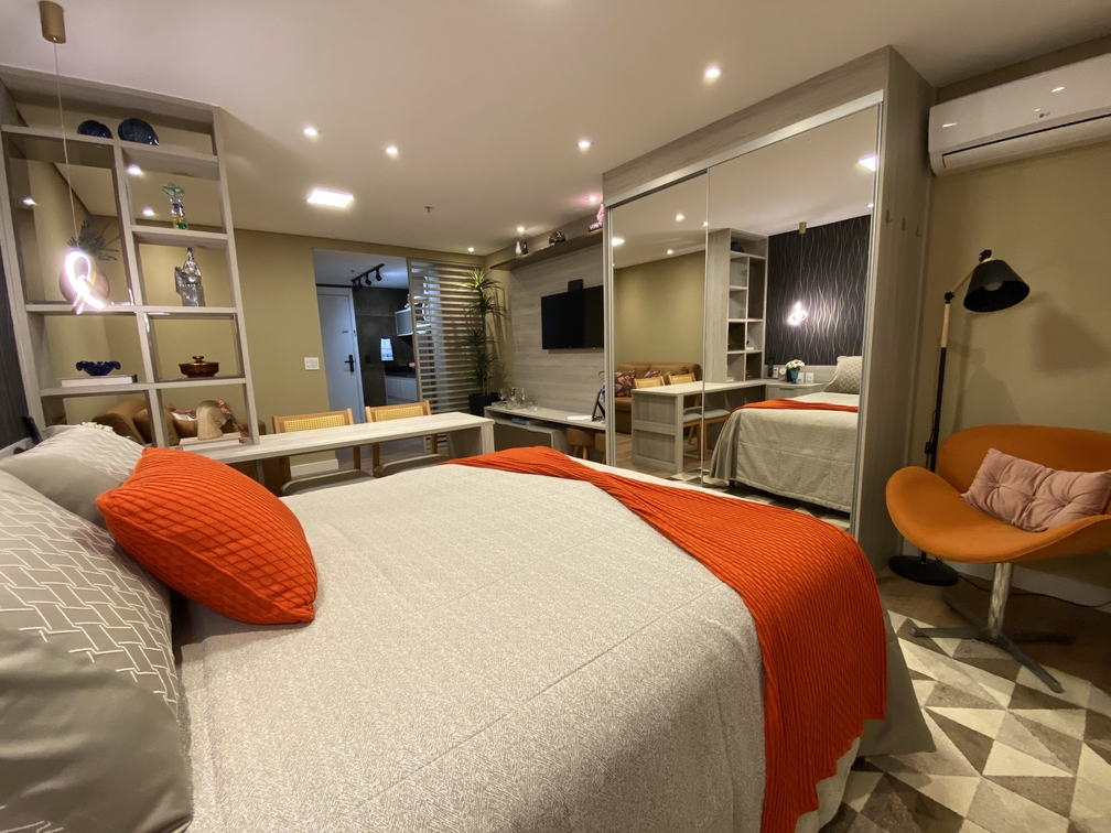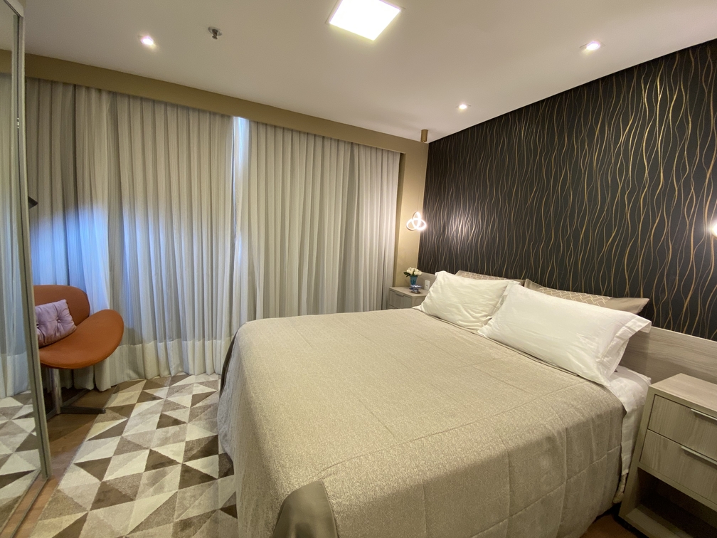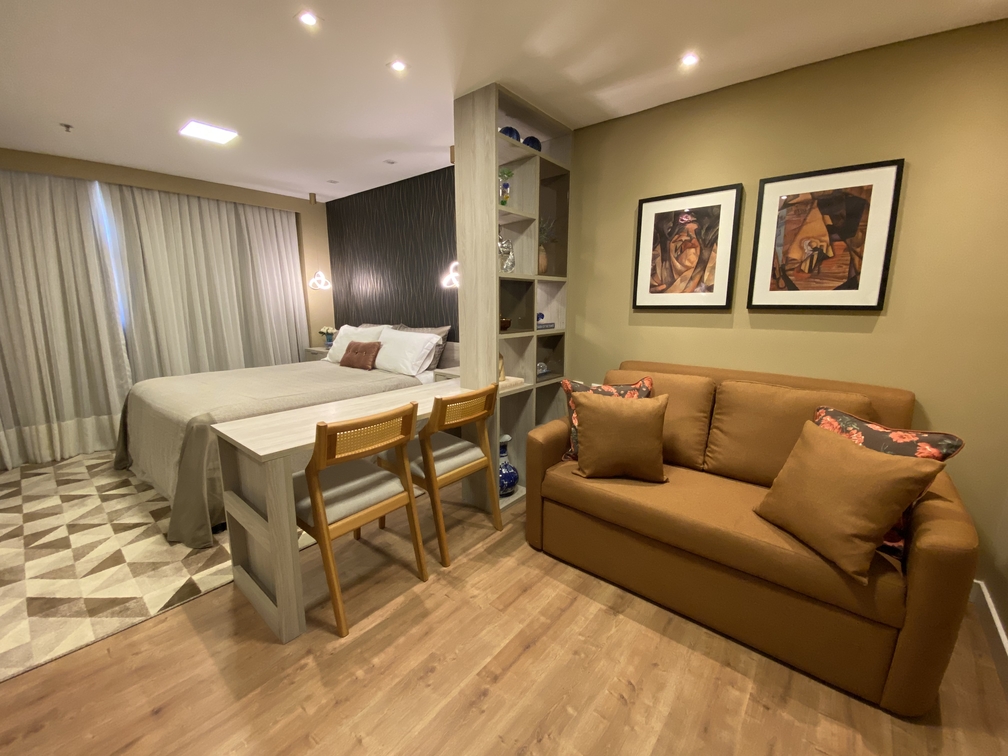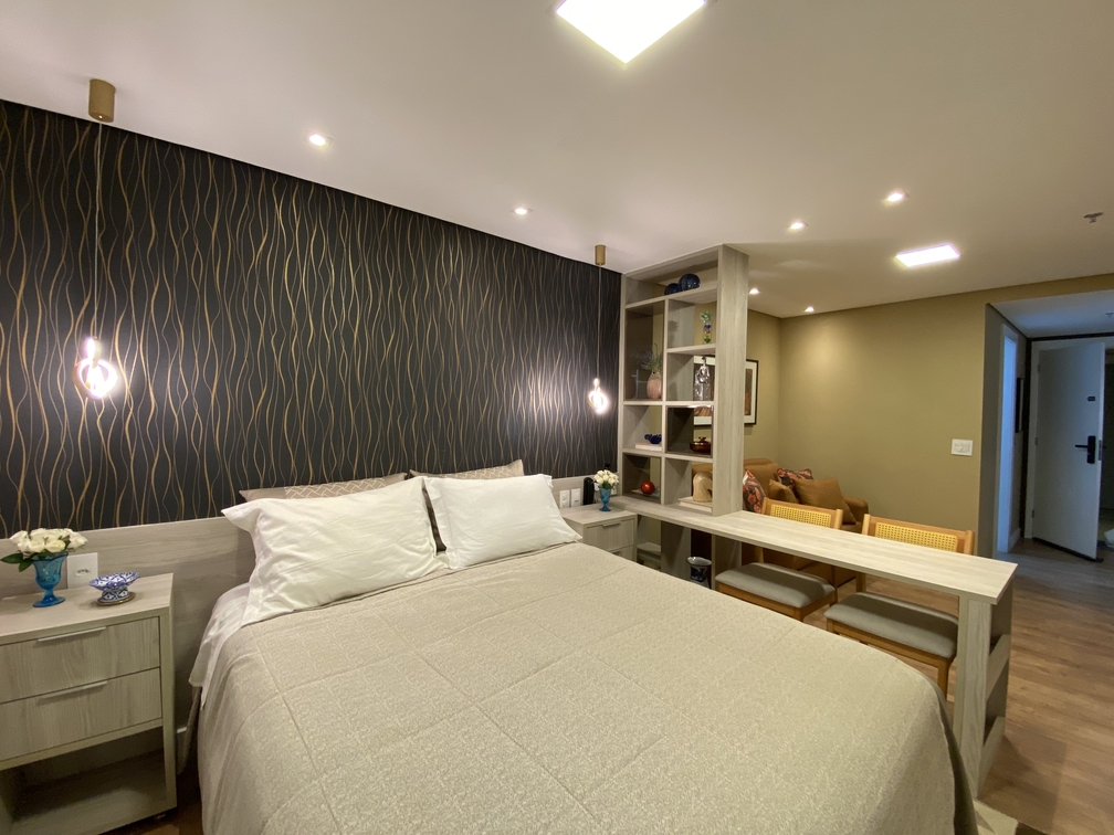 Suíte de 35 m² com cama queen e sofá-cama, além disso, inclui enxoval, amenities, smart TV, ar condicionado split, copa equipada com máquina de café em cápsulas, geladeira e micro-ondas. Para sua comodidade, a suíte conta também com internet wireless e secador de cabelo.