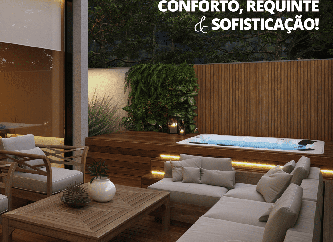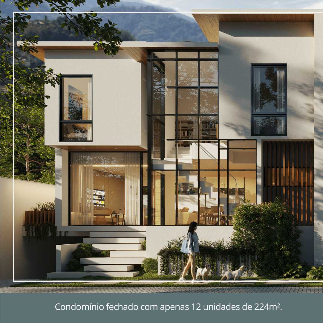 O condomínio fechado conta com apenas 12 unidades de 224m², cada uma com garagem privativa para 3 veículos, área SPA, 3 suítes, home office e ampla sala com 2 ambientes integrados à cozinha e área gourmet. Além disso, cada unidade inclui espaço para adega e conexão para carregamento de veículos elétricos, tudo com acabamento de alto padrão. A área externa privativa oferece várias opções de uso, como um espaço gourmet, área kids ou até mesmo um espaço para yoga ou meditação, com previsão para instalação de hidromassagem.